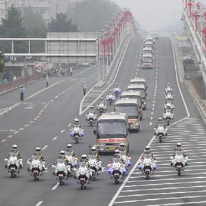 這是“七一勛章”獲得者集體乘坐禮賓車從住地出發,由國賓護衛隊護衛前往人民大會堂。