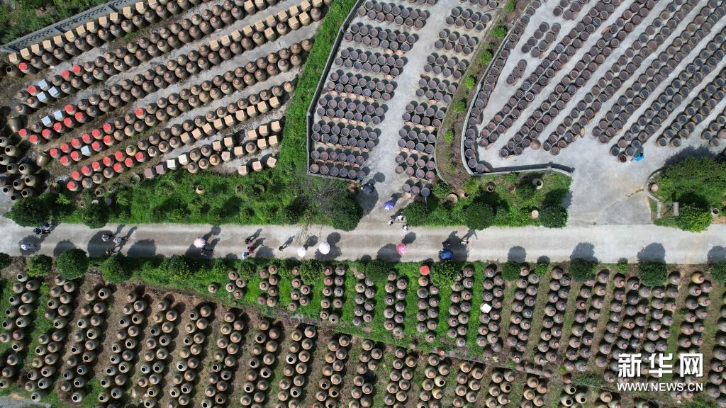 7月10日,游客在畢節(jié)市金沙縣禹謨鎮(zhèn)泡木灣醬醋基地參觀(無人機照片)。新華社發(fā)(韓賢普攝)