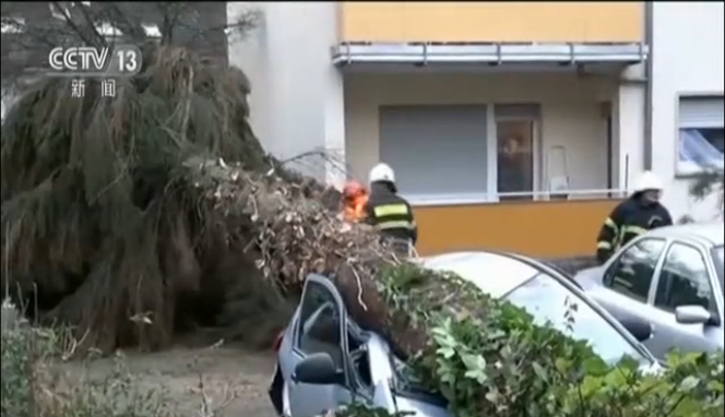 A video released by CCTV shows that storm Eleanor is slamming Germany. Roads were blocked by falling tree parts.