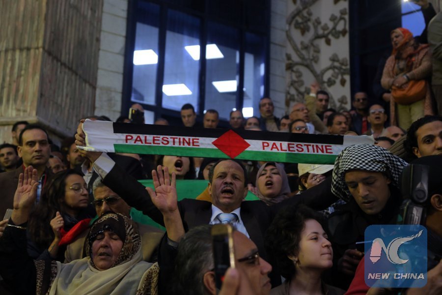 People attend a protest against the U.S. decision to recognize Jerusalem as Israel's capital, in Cairo, Egypt, on Dec. 7, 2017. (Xinhua/Ahmed Gomaa)