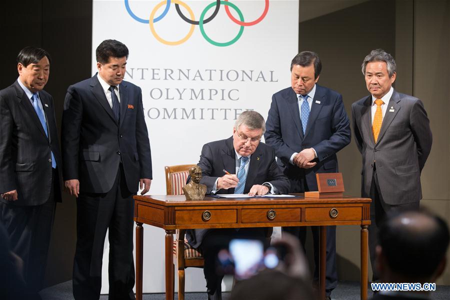 Lee Hee-beom, president of the PyeongChang Organizing Committee for the 2018 Olympic and Paralympic Winter Games (POCOG), the Democratic People's Republic of Korea (DPRK)'s Olympic Committee President and Sports Minister Kim Il Guk, International Olympic Committee (IOC) President Thomas Bach, South Korea's Sports Minister Do Jong-hwan and South Korea's President of the National Olympic Committee (NOC) Lee Kee-heung (From L to R) attend a signing ceremony after a four-party meeting at the IOC headquarter in Lausanne, Switzerland, Jan. 20, 2018. (Xinhua/Xu Jinquan)