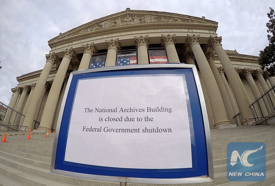 A sign indicating that the National Archives Building is closed due to the federal government shutdown is seen in Washington D.C., the United States, on Jan. 22, 2018. (Xinhua/Yin Bogu)