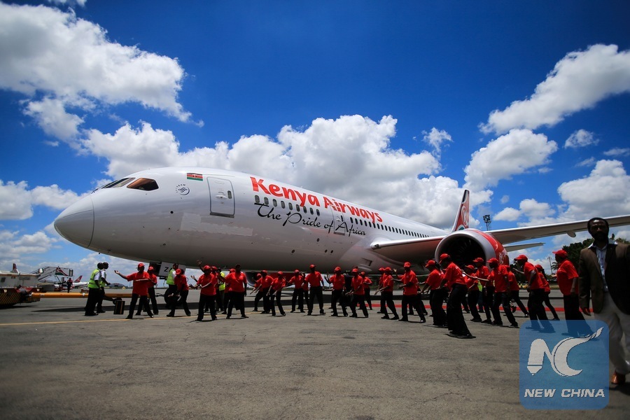 File photo shows Kenya Airways' first Boeing 787 Dreamliner "Great Rift Valley" is seen at the Jomo Kenyatta International Airport in Nairobi, capital of Kenya, April 5, 2014. (Xinhua/Meng Chenguang)