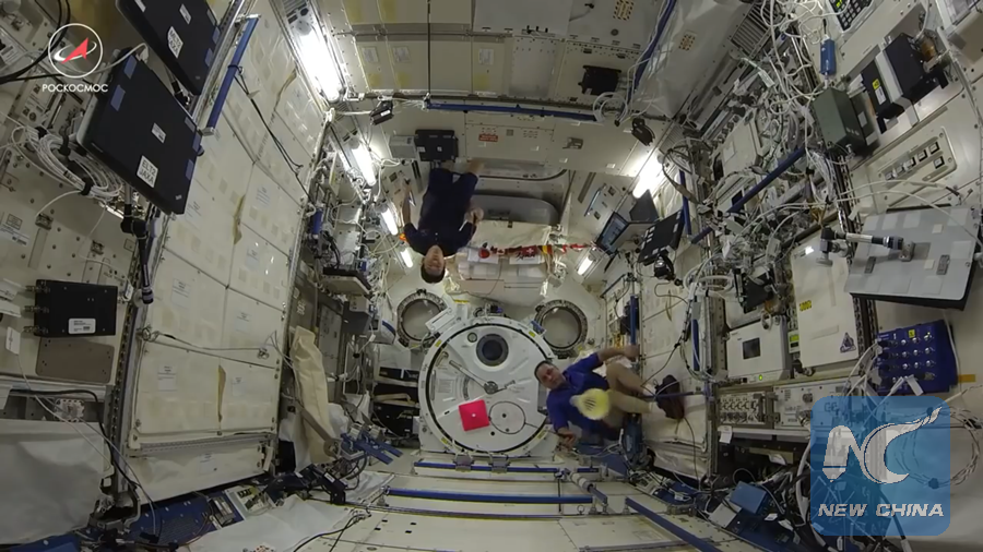 The photo taken from a footage published by Roscosmos on February 6, 2018 shows a scene of the first badminton game on board the International Space Station played by astronauts from Russia, the United States and Japan. (Xinhua/Roscosmos)