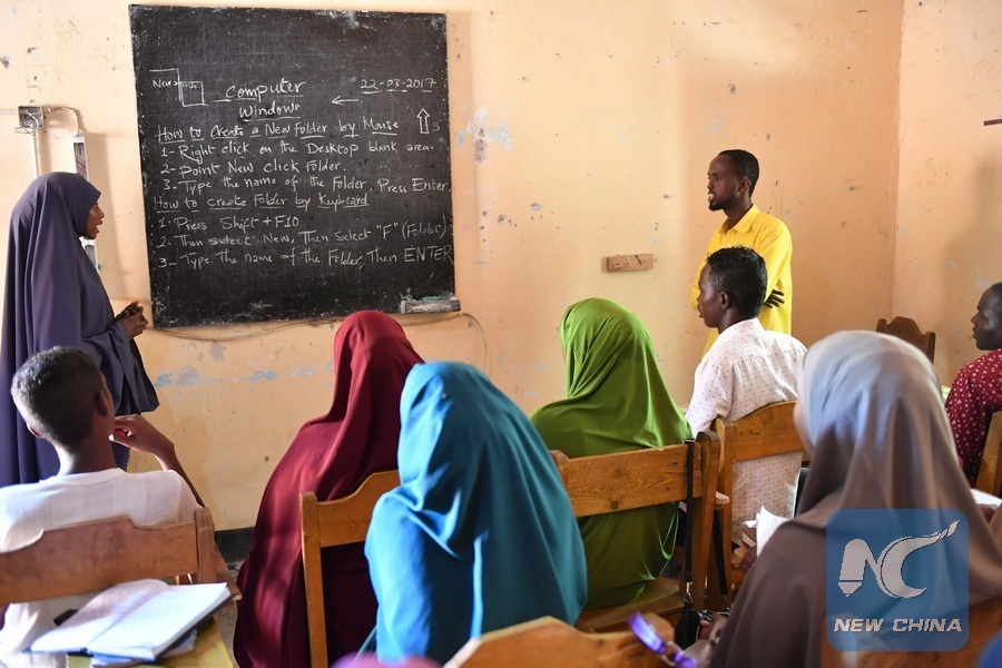 Trainees take a computer class at the training centre ELMAN, a non-government organization (NGO) which cooperates with the United Nations Children's Fund (UNICEF), in Mogadishu, Somalia, March 22, 2017. By the year of 2017, more than 1630 children and teenagers have taken vocational training courses such as automobile maintenance, basic electricity knowledge and circuit maintenance skills, mobile phone repairing and computer using. A vast majority of the students here were former child soldiers or affected by armed groups. The knowledge and skills they learned here will help them to start a new life once they are reintegrated into their communities. (Xinhua/Sun Ruibo)