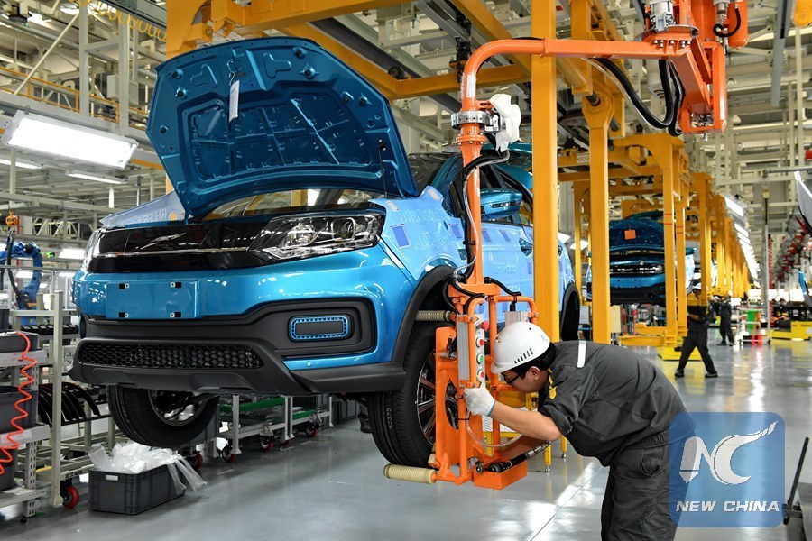 Workers are seen at an assembly line of Yudo new-energy vehicles (NEVs) in southeast China's Fujian Province, Dec. 20, 2017. (Xinhua/Zhang Guojun)
