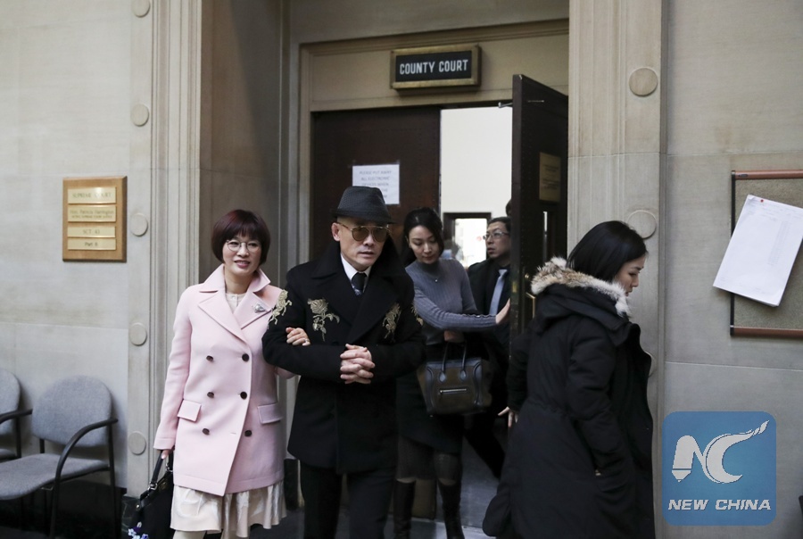 Zhou Libo (2nd L) walks out of the Nassau County Court after a court session in Nassau County, New York, the United States, on Feb. 22, 2018. (Xinhua/Wang Ying)