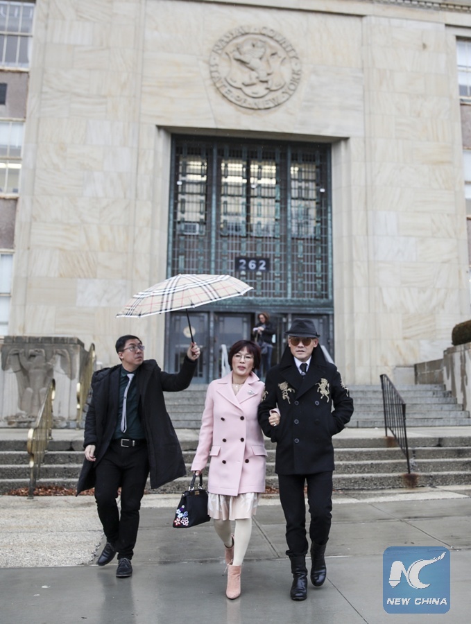Zhou Libo (R) walks out of the Nassau County Court after a court session in Nassau County, New York, the United States, on Feb. 22, 2018. (Xinhua/Wang Ying)