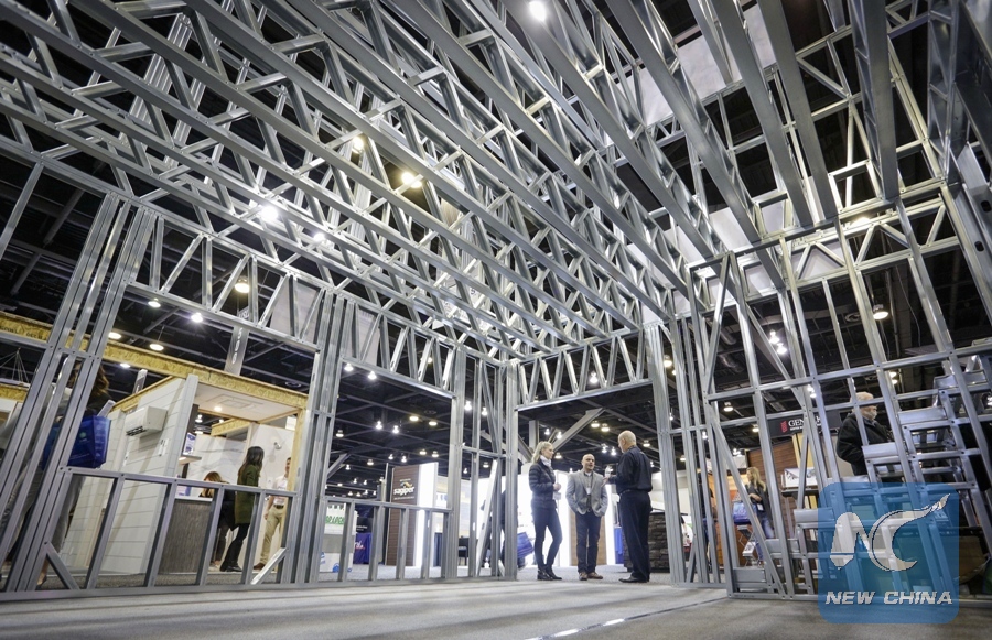 An exhibitor showcases a large scale steel house frame structure at the BUILDEX trade show in Vancouver, Canada, Feb. 15, 2018. (Xinhua/Liang Sen)