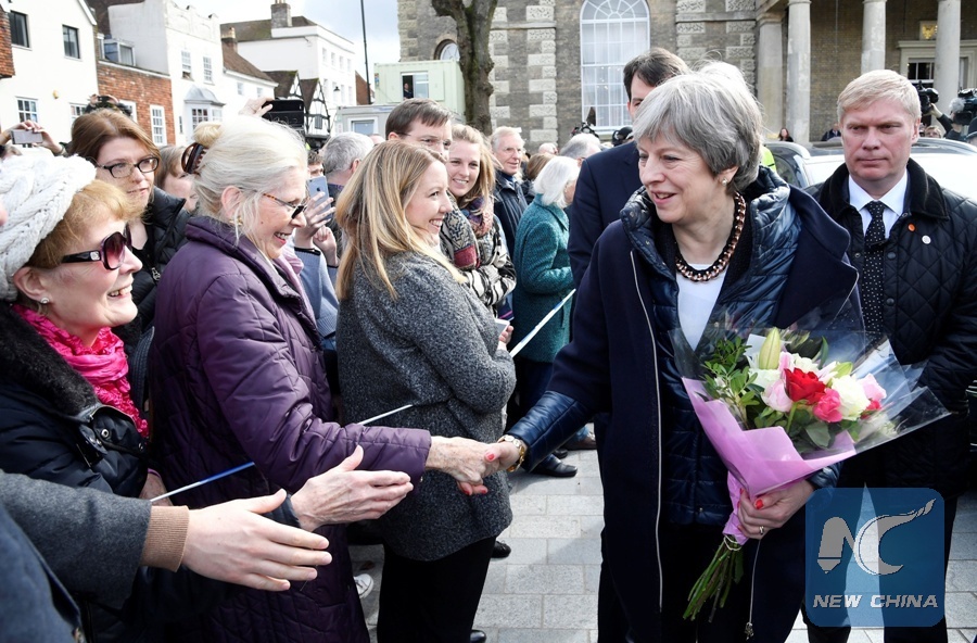Britain's Prime Minister Theresa May (2R) meets members of the public during her visit to Salisbury, southern England, on March 15, 2018, where she visited the areas where former Russian double agent Sergei Skripal and his daughter Yulia went to, and were discovered at, following an apparent nerve agent attack on March 4. (Xinhua/AFP)