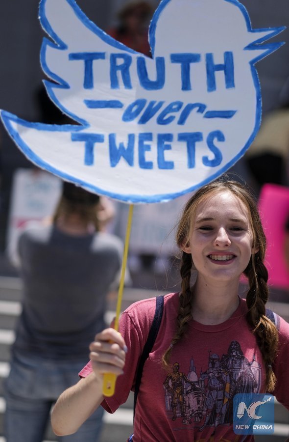 A girl holding a placard participates in the March for Truth rally in Los Angeles, the United States, on June 3, 2017. Rallies and marches took place across the country to call for investigation into possible Russian interference in the U.S. election and the links between Donald Trump's administration and Russia. (Xinhua/Zhao Hanrong)