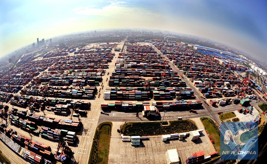 Photo taken on Oct. 29, 2013 shows the bird's-eye view of the Waigaoqiao container pier of the Shanghai free trade zone (FTZ) as seen from a patrol helicopter, in Shanghai, east China. (Xinhua/Fan Jun)