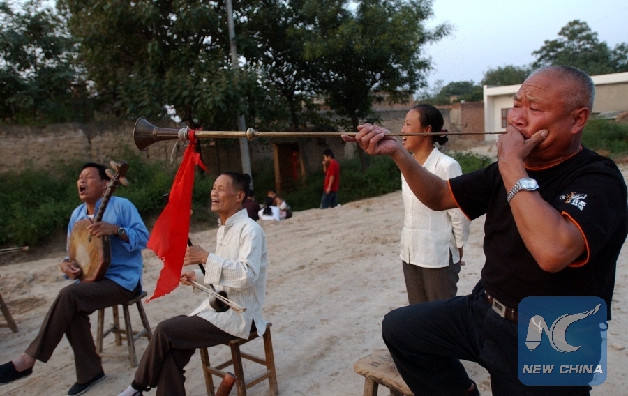 File Photo: Folk artists perform Laoqiang Opera after they finish a whole day's farm work, in Huayin of northwest China's Shaanxi Province, on Sept. 15, 2006. (Xinhua Photo/Gao Jing)