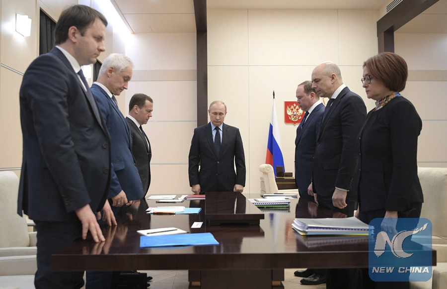 Russian President Vladimir Putin (C) observes a minute of silence in memory of the victims of a shopping mall fire in Kemerovo before chairing a meeting on economic issues outside Moscow, Russia on March 28, 2018. (KREMLIN PHOTO)