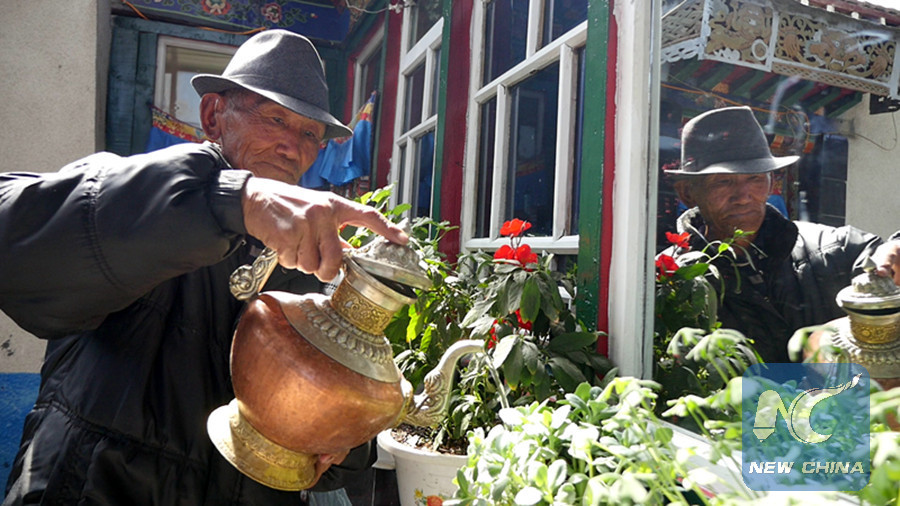 Sonam Dondrup, 75, once a serf, waters flowers at home, March 20, 2018. (Xinhua/Yu Gang)
