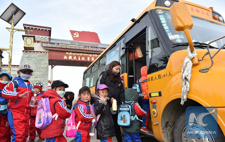 Children in Khesum Village take the school bus to school, March 27, 2018. (Xinhua/Chogo)