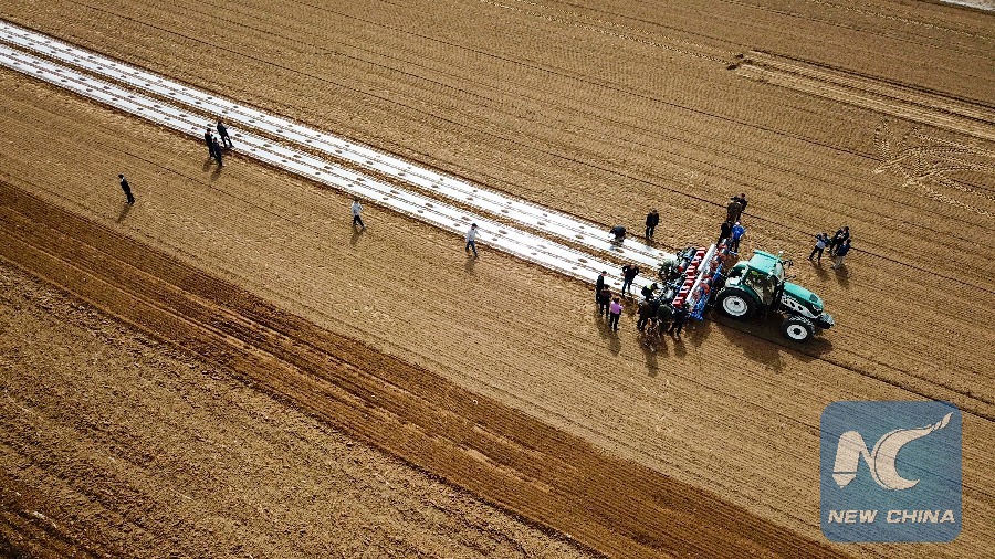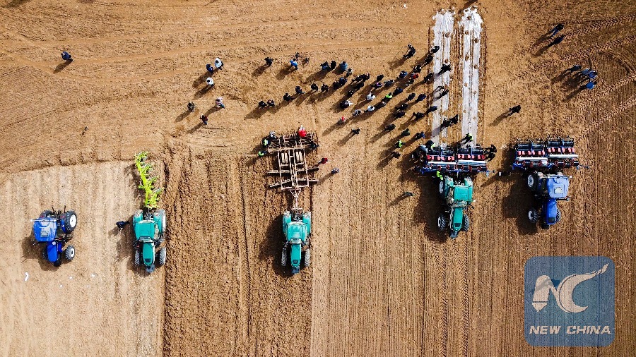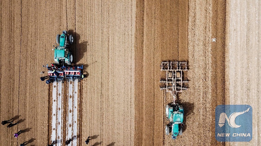 Aerial photo shows a self-driving tractor sowing cotton seeds in the field. (Xinhua/Hu Huhu)