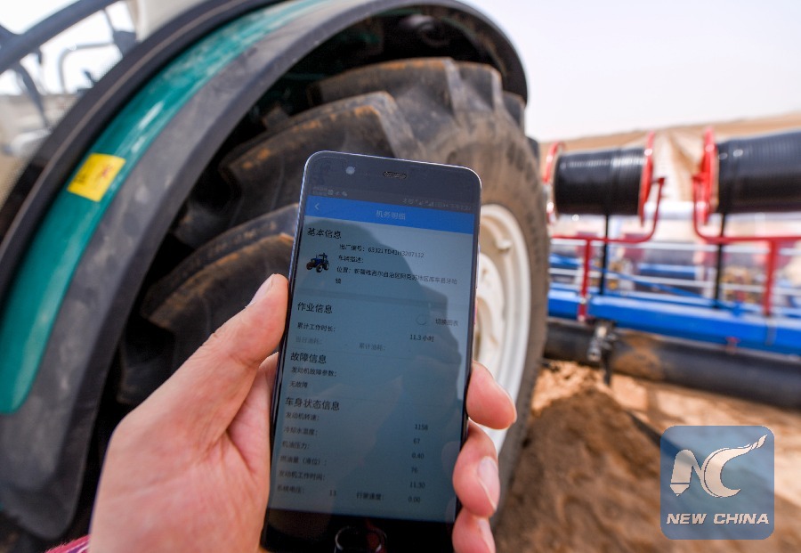 A technician shows a mobile app with information about a self-driving tractor. (Xinhua/Hu Huhu)