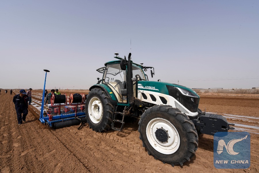 A self-driving tractor sows cotton seeds in the field. (Xinhua/Hu Huhu)