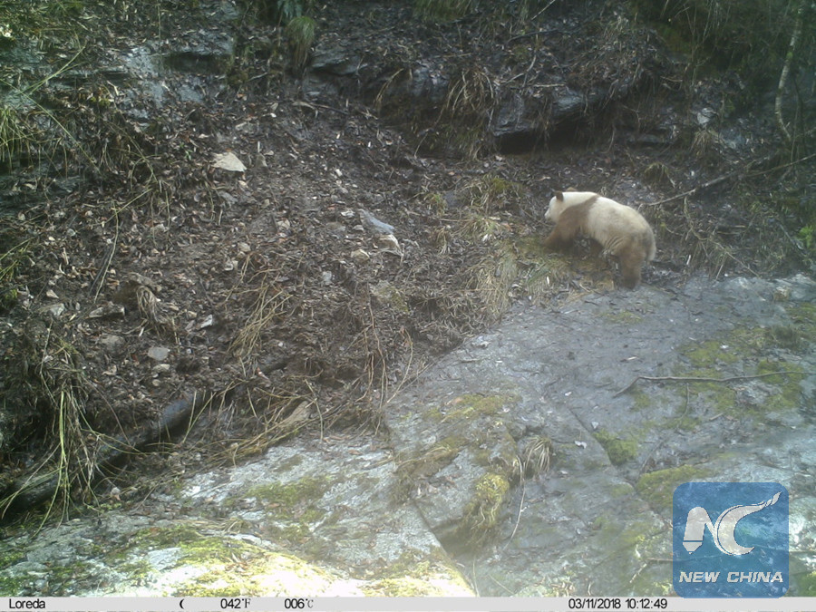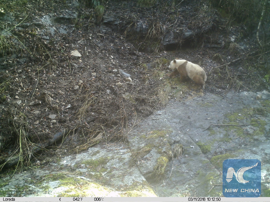 A brown giant panda was spotted in the Changqing National Nature Reserve, northwest China's Shaanxi Province, March 11, 2018.(Xinhua/Changqing National Nature Reserve)