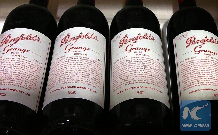 Bottles of Penfolds Grange, made by Australian wine maker Penfolds and owned by Australia's Treasury Wine Estates, sit on a shelf for sale at a wine shop in central Sydney, Australia, August 4, 2014. (Xinhua/REUTERS)