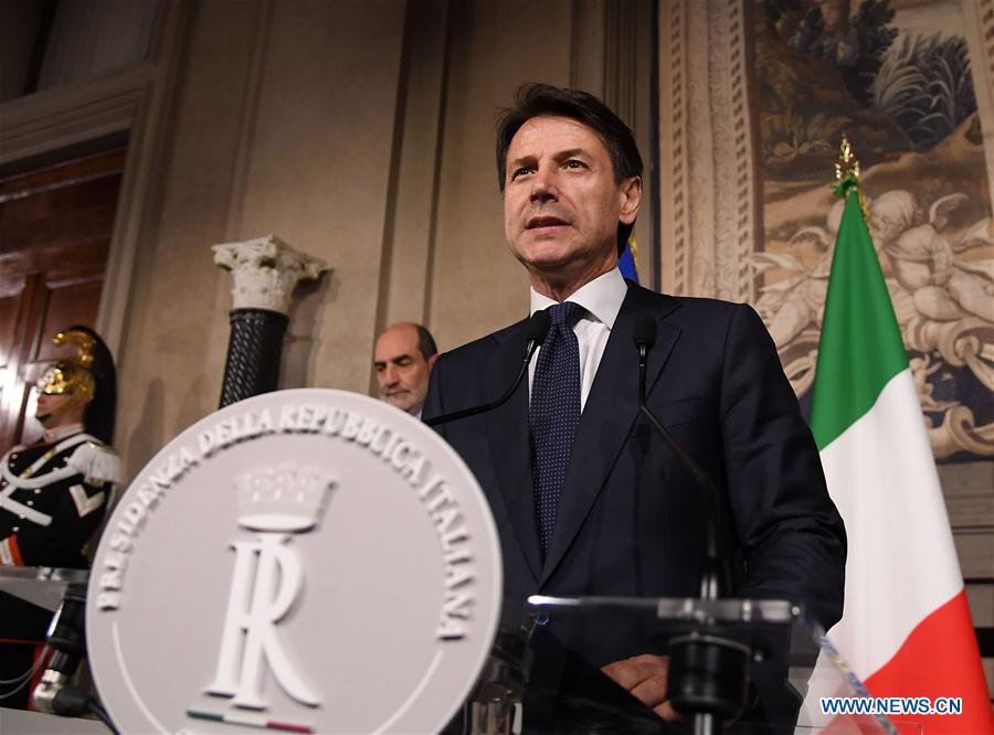 Giuseppe Conte (Front) addresses a press conference after meeting with Italian President Sergio Mattarella in Rome, Italy, on May 31, 2018. Italian law professor Giuseppe Conte was reappointed as Prime Minister-designate to lead a coalition government on Thursday, the presidential palace stated. (Xinhua/Alberto Lingria)