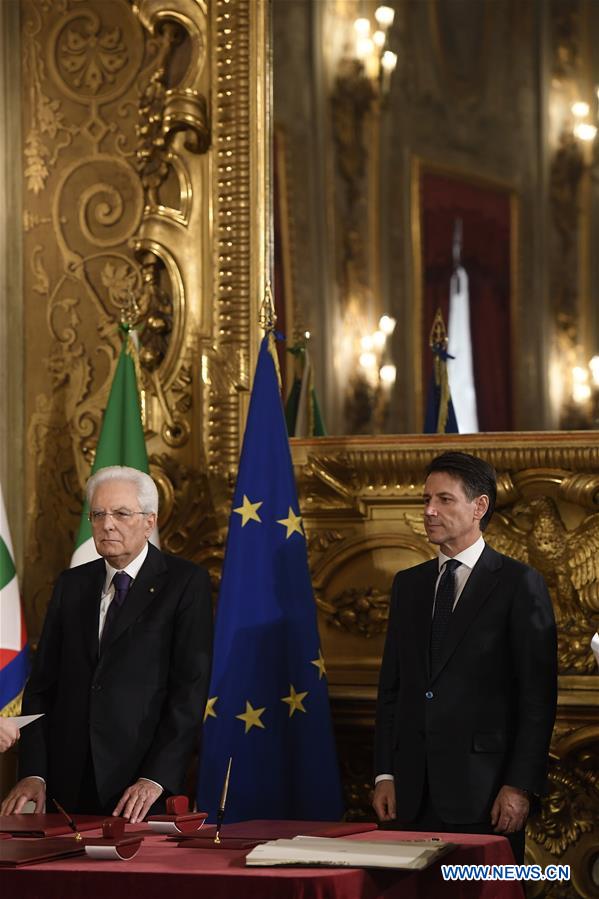 Italian President Sergio Mattarella (L) and Prime Minister Giuseppe Conte attend the swearing-in ceremony of the new cabinet at the Quirinal Palace in Rome, Italy, June 1, 2018. Italy's new government of Prime Minister Giuseppe Conte was officially sworn in here on Friday, putting an end to a deadlock lasting since early March inconclusive vote. (Xinhua/Alberto Lingria)