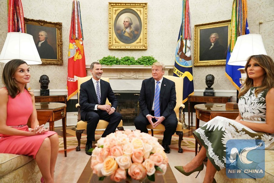 U.S. President Donald Trump and First Lady Melania Trump meet with Spain's King Felipe VI and Queen Letizia in the Oval Office of the White House in Washington, D.C. on June 19, 2018. (Xinhua/AFP)