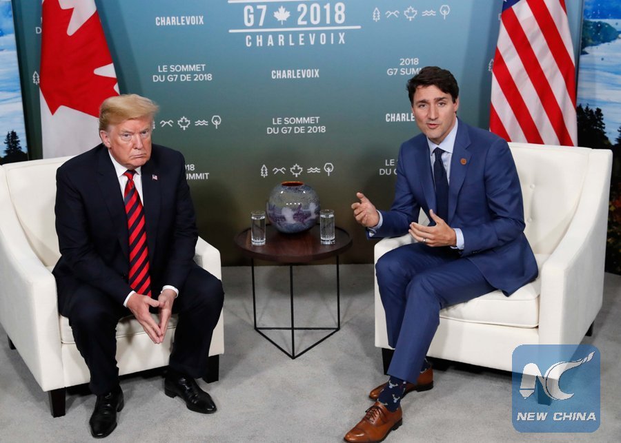 U.S. President Donald Trump meets with Canada's Prime Minister Justin Trudeau in a bilateral meeting at the G7 Summit in in Charlevoix, Quebec, Canada, June 8, 2018. (Xinhua/REUTERS)
