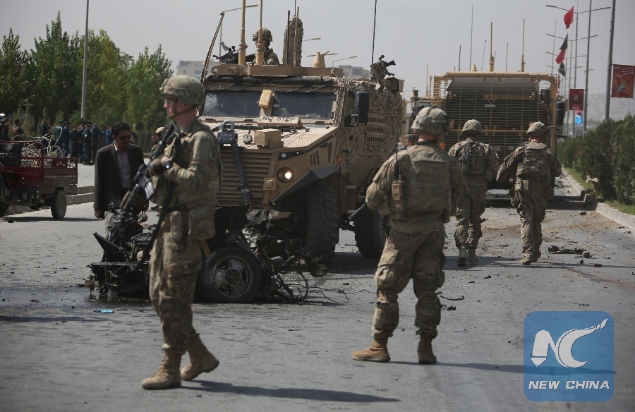 File Photo: NATO soldiers inspect the site of a suicide attack in Kabul, Afghanistan, Sept. 24, 2017. Three Afghan civilians were wounded after a bomb attack hit a NATO military convoy in western side of Kabul, authorities said. (Xinhua/Rahmat Alizadah)