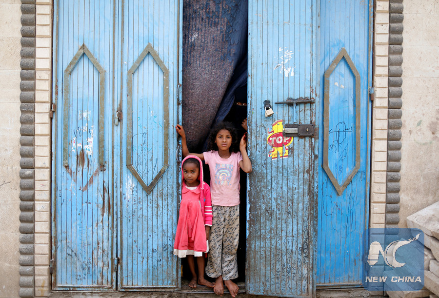 Girls displaced from Yemen's northwestern province of Saada stand with their mother outside a temporary shelter in Sanaa, Yemen on July 3. (Reuters photo)