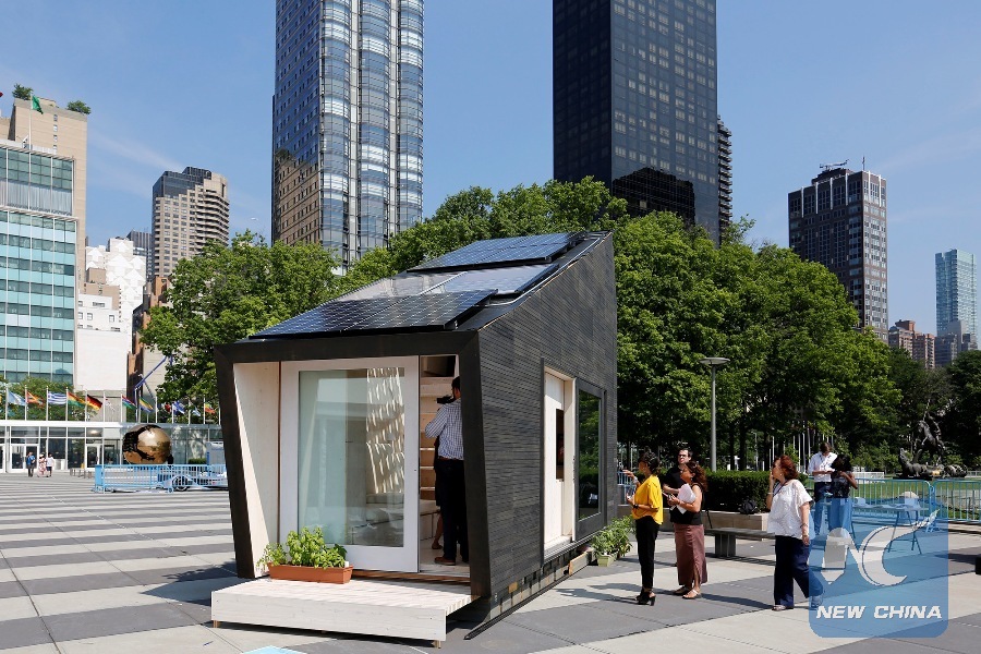 An Ecological Living Module, a 22 square meter tiny house, is displayed at the United Nations headquarters in New York, the United States, on July 16, 2018. (Xinhua/Li Muzi)