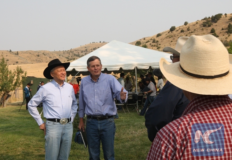 Steve Daines (2nd L), a senator from U.S. state of Montana, and Cui Tiankai (L), Chinese Ambassador to the United State, speak with Fred Wacker and other cattle ranchers at the Morgan Ranch House, near downtown Bozeman, Montana, the United States, on Sept. 8, 2017. (Xinhua/Yan Liang)