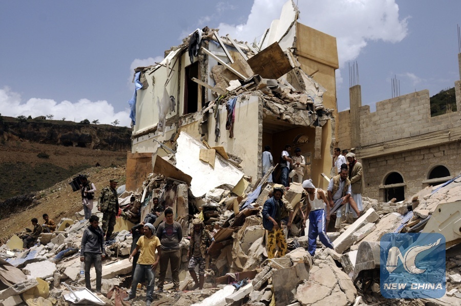People stand on the ruins of a building destroyed in the airstrike in Sanaa, Yemen, Aug. 25, 2017. (Xinhua/Mohammed Mohammed)