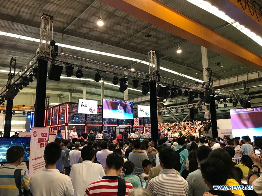 Visitors watch a robot combat at the 2018 World Robot Conference in Beijing, Aug. 17, 2018. The conference attracts a total of 166 domestic and international enterprises exhibiting their cutting edge technologies and more than 500 items are displayed at the scene. (Xinhuanet/Liang Yurou)