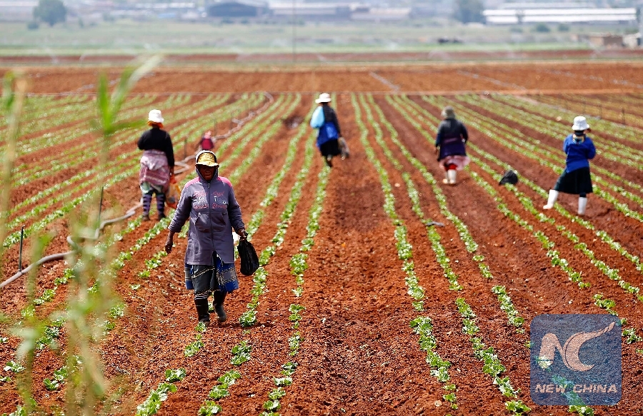 Farm workers stand in a field at a farm in Klippoortie, east of Johannesburg in this Nov. 21, 2012 file photo. (Xinhua/REUTERS)