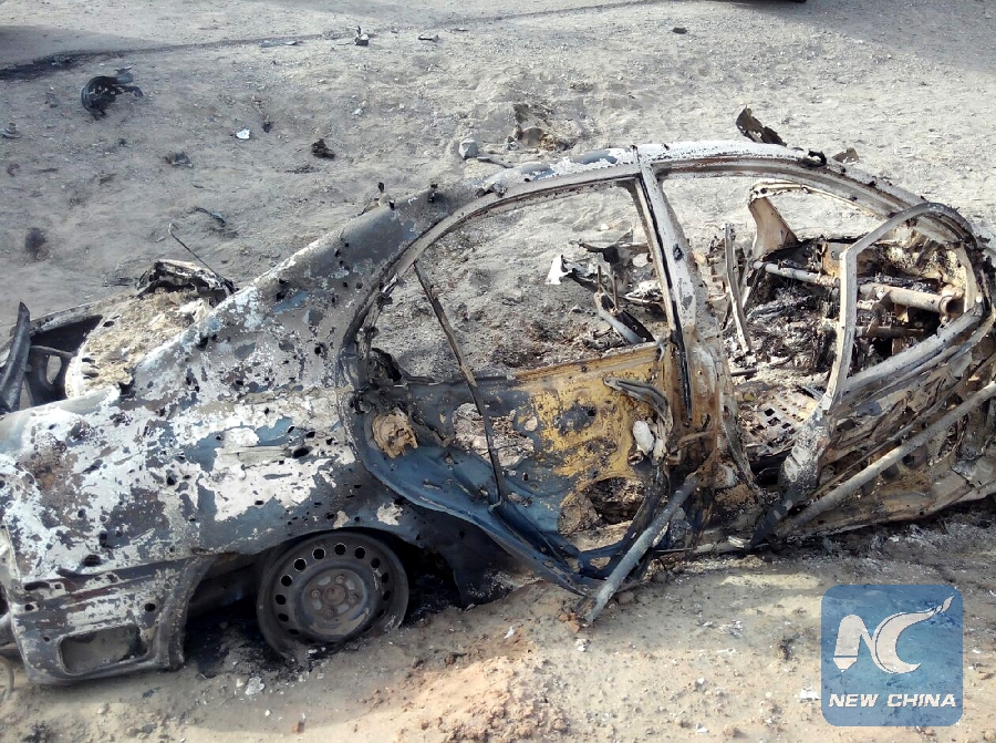 File photo taken with mobile phone on May 22, 2016 shows a destroyed vehicle believed to be hit by a U.S. drone strike in Ahmad Wal, a small town in Pakistan's southwest Balochistan province. Pakistani government sources have confirmed the killing of the Afghan Taliban top leader Mullah Akhtar Mansoor in a U.S. drone strike in the country's southwest remote area of the Pak-Afghan border region, reported local Urdu TV channel ARY. (Xinhua/Stringer)