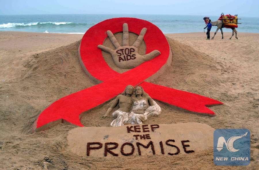 File Photo: A man walks a camel past a sand sculpture created by Indian sand artist Sudarshan Patnaik to create awareness about AIDS ahead of World AIDS Day on a beach in Puri, in the eastern Indian state of Odisha Nov. 29, 2013. (Xinhua/REUTERS)