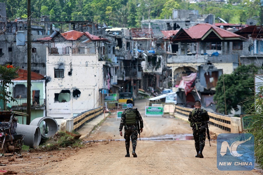 In this file photo, soldiers from the Armed Forces of the Philippines walk to a bridge in the war-tornMarawi City, the Philippines, May 22, 2018. (Xinhua/Rouelle Umali)