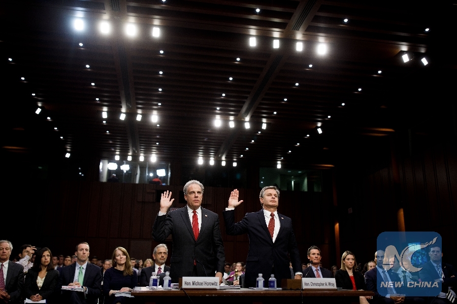 File Photo: U.S. Justice Department Inspector General Michael Horowitz (L) and FBI Director Christopher Wray take the oath before testifying to the Senate Judiciary Committee hearing on "Examining the Inspector General's First Report on Justice Department and FBI Actions in Advance of the 2016 Presidential Election" on the Capitol Hill in Washington D.C., the United States, on June 18, 2018. (Xinhua/Ting Shen)