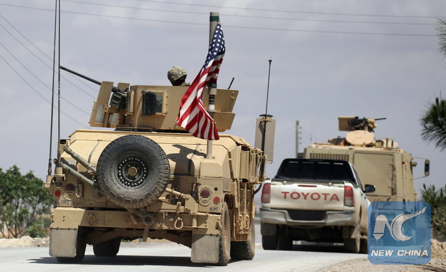 The U.S. flag flutters on a military vehicle in Manbej countryside,Syria May 12, 2018. (Xinhua/REUTERS)