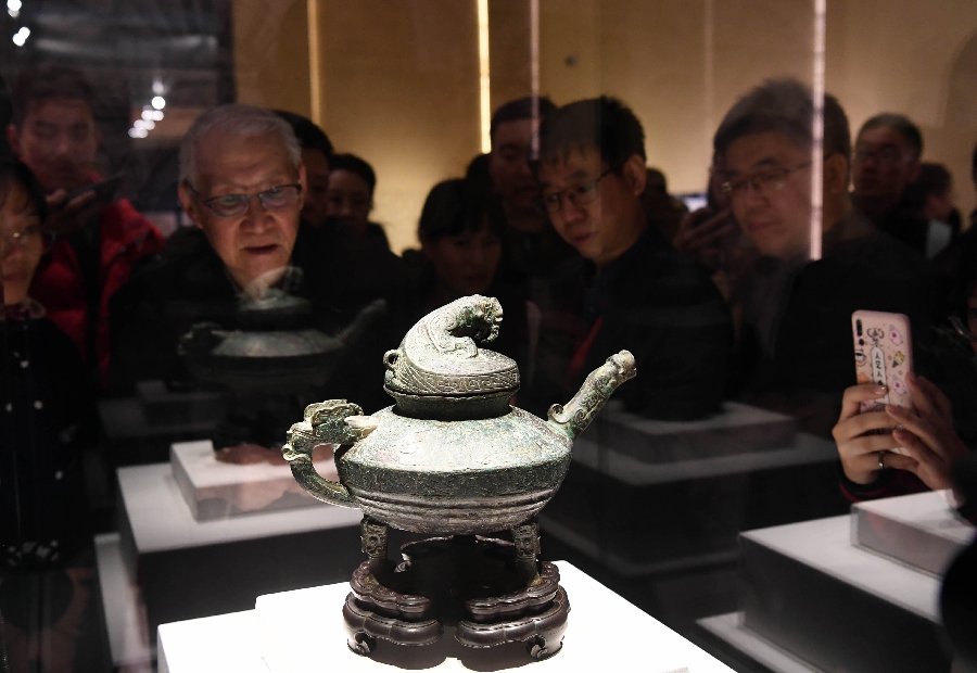 Visitors view the vessel known as the Bronze Tiger Ying at the National Museum of China in Beijing, capital of China, Jan. 29, 2019.(Xinhua)