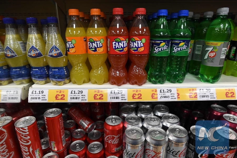 File Photo: Cans and bottles of fizzy drinks are seen on a shelf in a convenience store in Birkenhead, north-west England on Nov. 20, 2017. (Xinhua/AFP)