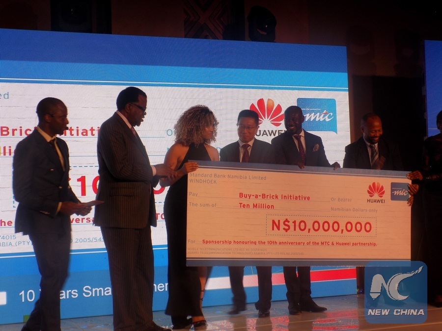 File photo shows Namibian President Hage Geingob (2nd L) and other participants hold a donation cheque during a 10-year partnership celebrations between Namibia's telecommunications provider MTC and China's Huawei, in Windhoek, Namibia, Nov. 27, 2018.(Xinhua/Musa C Kaseke)