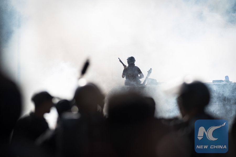 File Photo: Egyptian policemen shoot teargas booms to disperse pro-Muslim Brotherhood students outside the campus of Cairo University, Cairo, capital of Egypt, on March 26, 2014. (Xinhua/Pan Chaoyue)