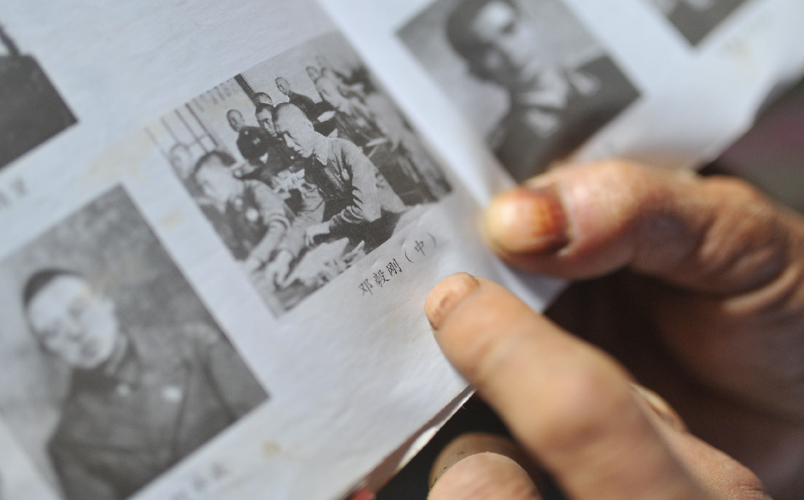 Villager Xie Nanjing shows a photo of martyr Deng Yigang at home in Shihan Village, Kuantian Town, Yudu County, east China's Jiangxi Province, June 13, 2019. (Xinhua/Li Renzi)