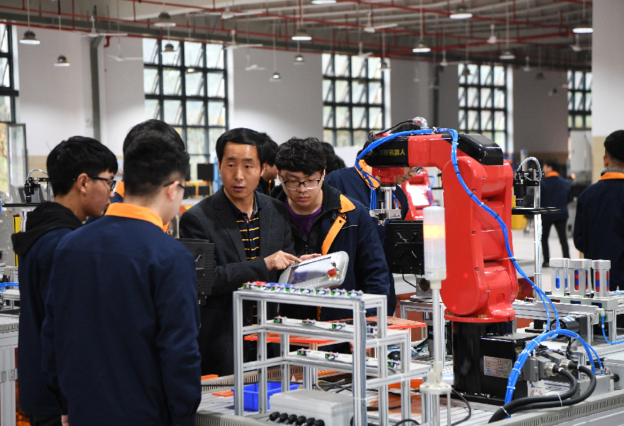 A teacher gives a lecture on industrial robots at a vocational education school in Yongchuan District of Chongqing, southwest China, March 14, 2019. (Xinhua/Wang Quanchao)