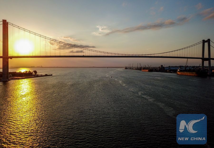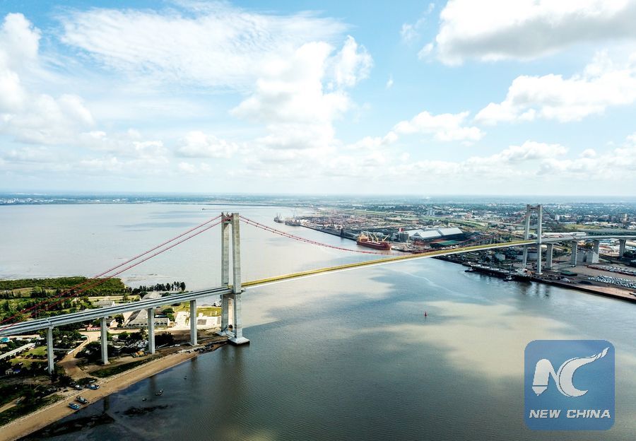 Aerial photo taken on April 8, 2019 shows the Maputo Bay Bridge in Maputo, Mozambique. The longest twin-tower suspension bridge in Africa, which hovers across the Maputo Bay with a main span of 680 meters, was officially open to traffic in November of 2018. The bridge is part of the Maputo Bridge and Link Roads project built by the China Road and Bridge Corporation, with Chinese standards and financing support. (Xinhua/Zhang Yu)