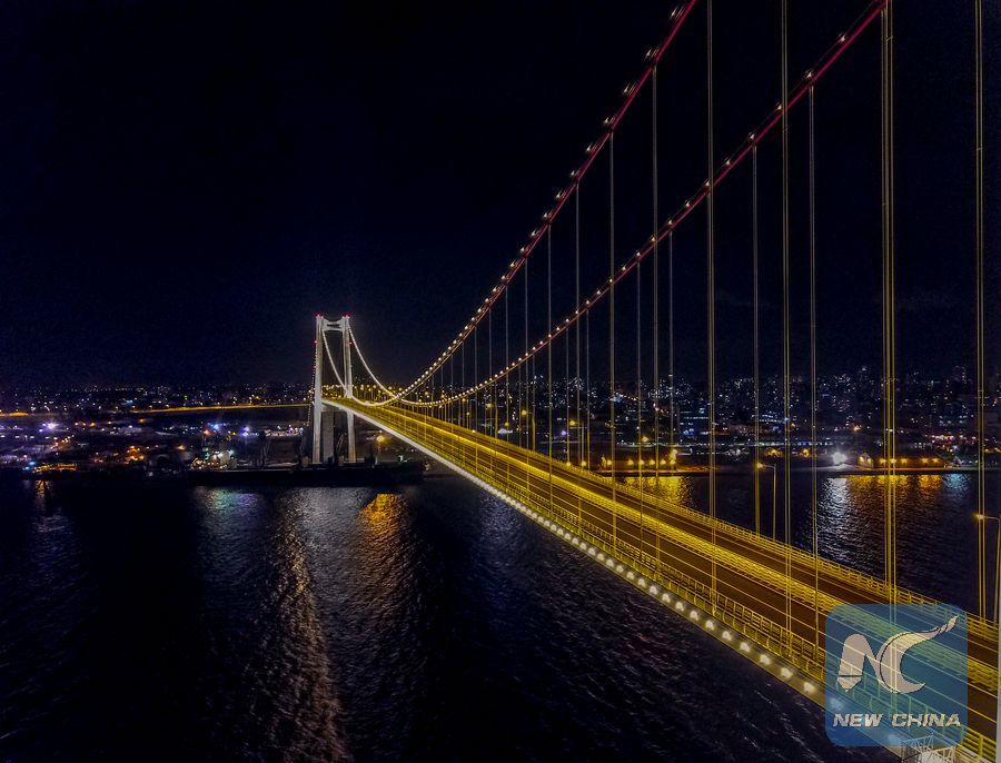 Aerial photo taken on April 9, 2019 shows a night view of the Maputo Bay Bridge in Maputo, Mozambique. (Xinhua/Zhang Yu)
