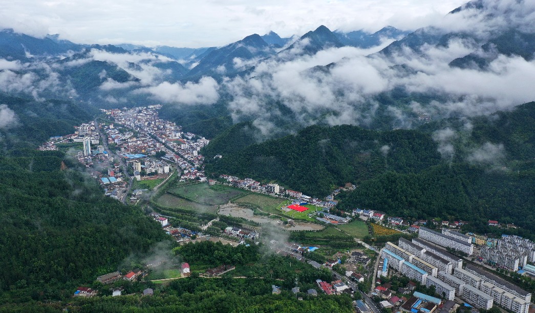 Aerial photo taken on July 12, 2019 shows general view of Liuba County of Hanzhong City, northwest China's Shaanxi Province. (Xinhua/Tao Ming)